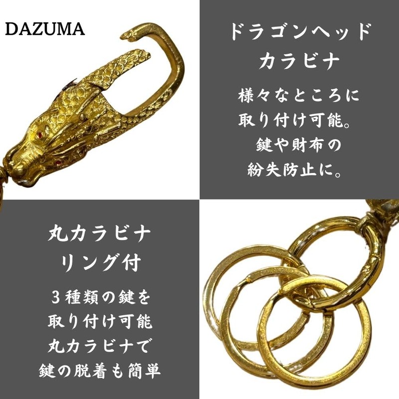 DAZUMA Key Chain, Dragon Head, Carabiner, Dragon Head, Strap, Feng Shui Goods, Money Luck, Blue Dragon, Smart Key, Car, Dragon 3 Rows (Gold), gold