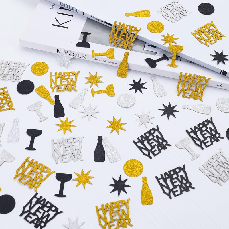 - Confetti New Year's Eve 2025 packing list: Our confetti New Year's Eve decoration 2025 party set contains approx. Pack of 100 New Year's Eve decoration confetti, including wine bottles, wine glasses, dots, stars, Happy New Year letters, 5 classic elements. Exquisite and versatile New Year's Eve decoration confetti can be used as a cute photo prop for your New Year's Eve party, highlights your theme quickly and creates a cheerful atmosphere for your celebration