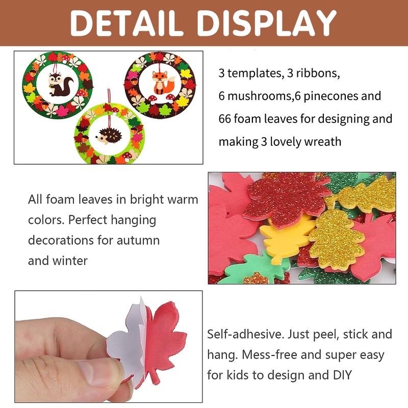 - Children's creative crafts: this autumn craft is a DIY game, could show your children creativity and promote their handling. It can also stimulate the child's hand-eye coordination ability and improve intelligence. Crafts for children are perfect for making family wreaths, group activities, family crafts and much more.