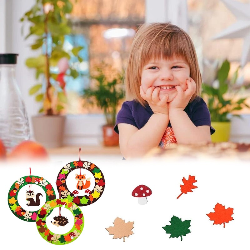 - Autumn wreaths craft set: 87 pieces, this felt decoration contains 3 felt autumn wreaths, 3 animal felts (hedgehog, fox and squirrel), 6 nut felts, 6 mushroom felts, 3 coloured ropes, 66 sheets. You can do it with children and friends. Get creative