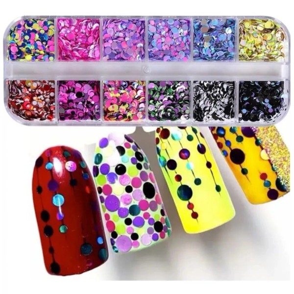 Estuche con 12 modelos de decoraciones variadas, como , acetatos en forma de confeti, todo para tus uñas o proyectos.