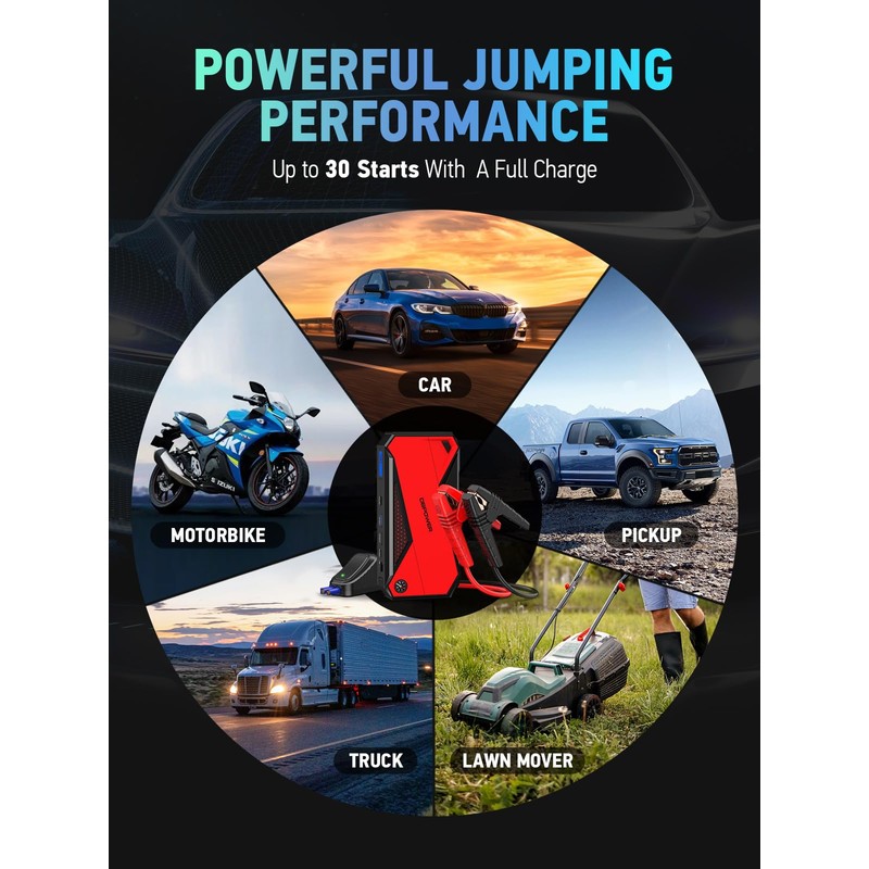 - POWERFUL & COMPACT: Jump start your vehicle (up to 7.2L gas or 5.5L diesel engine) up to 20 times with 1600 amps of peak current and heavy-duty clamps and cables. Compact enough to store in your glovebox.