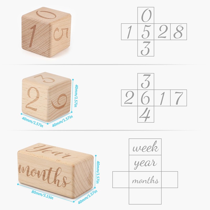 *Details- You will receive a set of cube age blocks, the fabric bag model contains 2 cubes and 1 rectangular block. The model of the gift box contains 4 cubes, 2 rectangular cubes and a card. The wooden blocks include "weeks", "months", "years" and a few numbers that will work well for you.