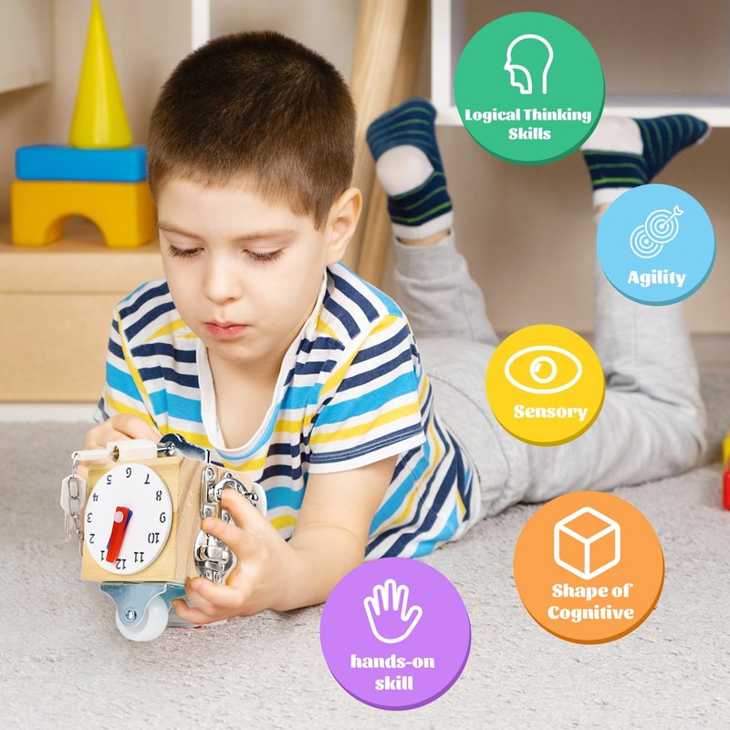 - Develops basic life skills: children can learn everyday skills with this activity cube toy, such as such as operating switches, unlocking with keys, tying shoelaces, gears and much more. Promotes children's cognitive skills, attention and learning ability.