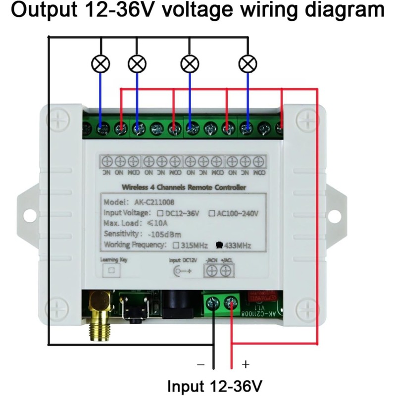 - 【4 Channel for Wireless Control 】the remote switch is a learning switch, it can learn different coding remote controls (such as 2262,1527 ect.) it can meet different customer needs. the output way /working way can be changed as you like, it is easy to match the transmitter. One/several transmitters can control one/several receivers simultaneously.They do not interfere with each other.