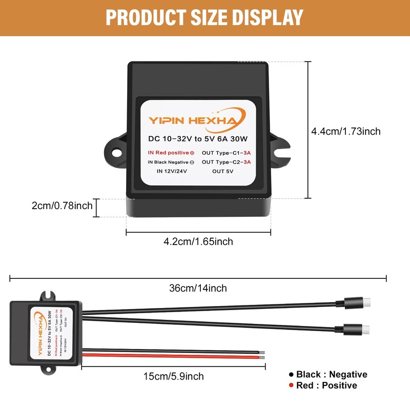 - 【Parameter Introduction】 Input voltage range: 10-32V; output voltage: DC5V, total output current: 6A max; total output power: 30W max (Type-C cable length: 12.2 inches 31cm)