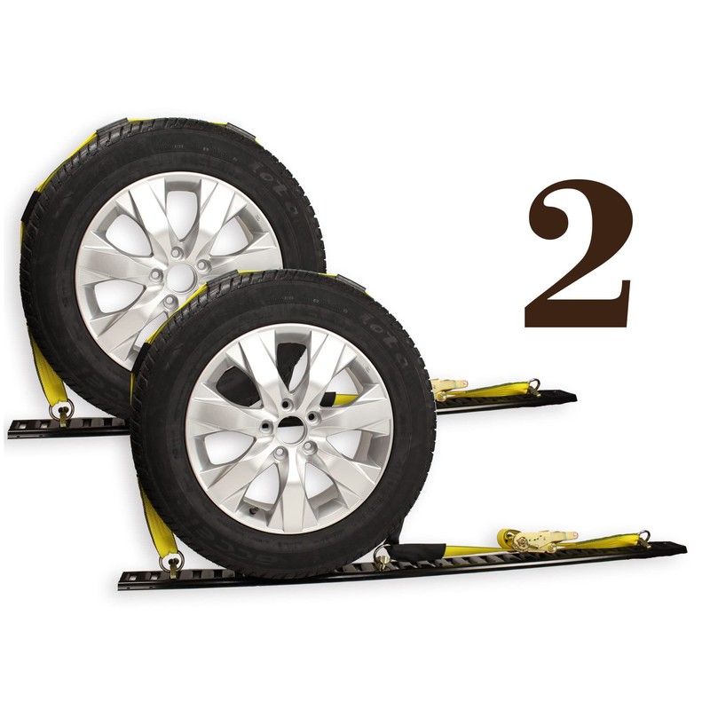- ✔ YOU GET: A 2 pack of 11' x 2" ratchet tow straps. Assembly Break Strength of 6,000 pounds, Working Load Limit of 3,000 pounds. Includes 3 adjustable RUBBER BLOCKS with molded cleats that grip into the rain grooves of the tire. These sliding tread grabs engage the tread of the tire and help keep the wheel stabilized in position. E-TRACK NOT INCLUDED.