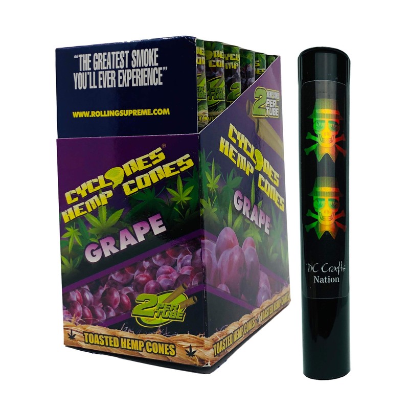 Includes: 1 DC Crafts Nation Pocket Protector & 24 Tubes (1 Box) of Cyclones Grape Pre-Rolled Cones (2 Cones Per Tube). Pocket Protectors by DC Crafts Nation keep your product fresh due to their airtight and moisture resistant features. Combining the convenience of a pop-top cap with an airtight design, these pocket protectors don't just lock in the freshness, but the odor as well. Cyclones pre-rolled cones are made from natural and contain no tobacco. The Cyclone cone is 100% pre-rolled and comes with a filling/packing stick. Not only is it easy to fill, but it comes in a flavor sealing reusable tube. You can even use the tube as a snuffer to extinguish a partially burning Cyclone.
