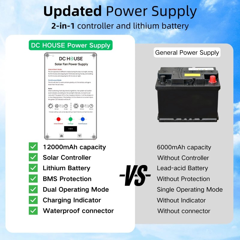 DC HOUSE 25W Solar Powered Exhaust Fan Kit with 12000mAh Lithium Battery Greenhouse Attic