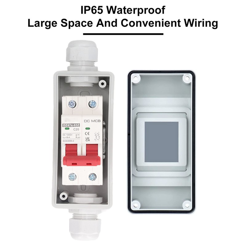 Specification Item Type: 2P Circuit Breaker Material: PA66Rated Current: 20ARRated Voltage: DC1000VIcu: 6000APackage List 1 x Circuit Breaker Box (Upper and Lower Parts)1 x Electric Tape2 x Waterproof Caps2 x Waterproof Joints2 x Rubber Rings2 x Waterproof Rings6 x Screws4 x Wall Plugs4 x Connection Terminals