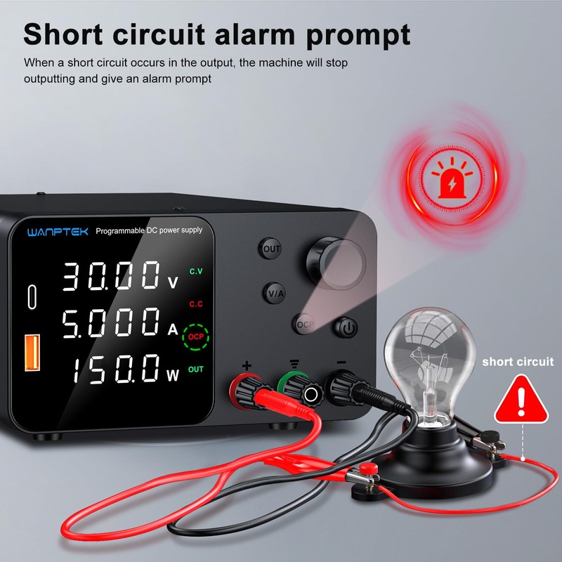 - OCP Short Circuit Alarm: The adjustable power supply has an OCP alarm function. When a short circuit occurs during the operation of the load equipment, the bench power supply will beep the alarm and stop the output to protect the power supply and the load from damage. It also has safety protection functions such as overvoltage, overcurrent, overload and overtemperature.