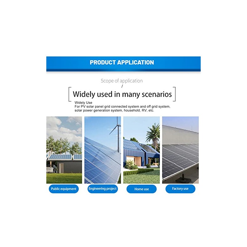 - Widely Use: Applicable to PV solar panel grid connected system and solar off grid system, solar power generation system, household, RV, etc.