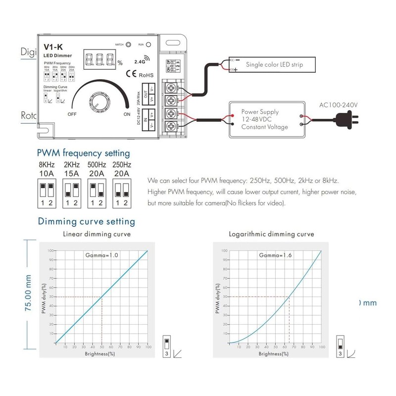 - Logarithmic or linear dimming curve selectable.