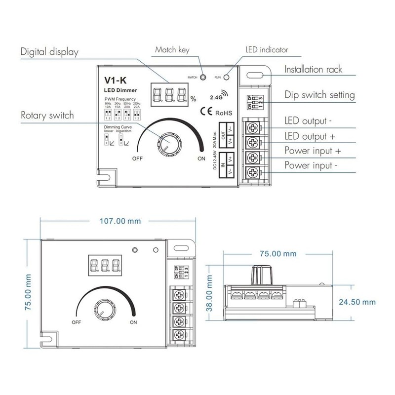 DC12V-48V 20A 2,000Hz LED Dimmer Controller Brightness Adjustable for Quad Row LED Strip Light