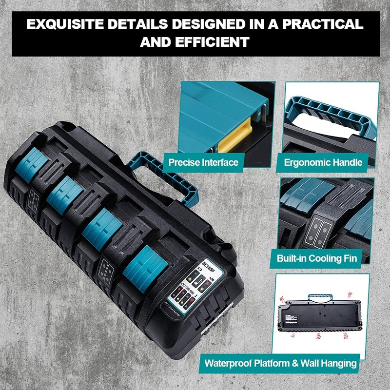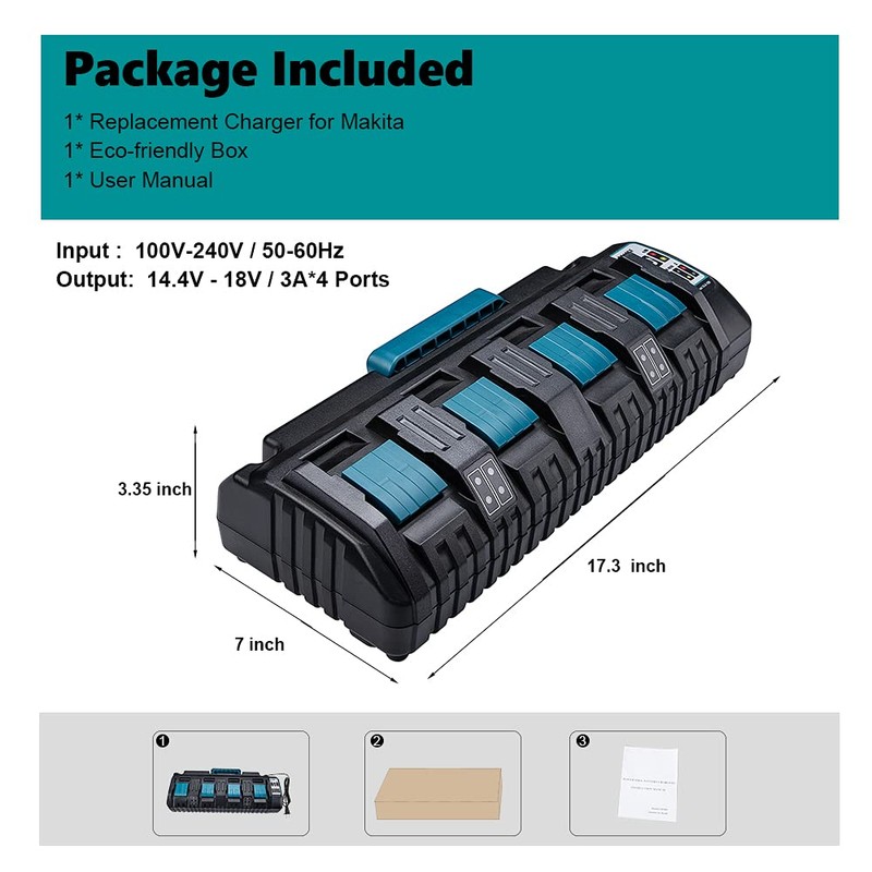 - 🔌【4-Port Charge Simultaneously & Each 3A Output】—— 4 pack of Makita 14.4V-18V LXT Lithium‑Ion batteries can be charged at the same time, minimizing downtime. 3-amps output per port for efficient charging and improve work efficiency. Enables you to move quickly from one task to the next with tools that are ready for the job