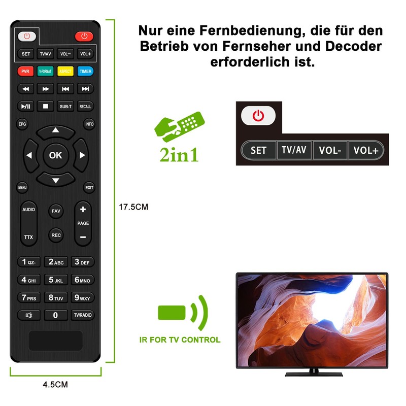 - đăEnergie sparungs strom versorgungăSat receiver hd kann ĂŒber DC 12V-Kabel angetrieben, bequemer und energiesparender beim camping. Das Paket enthalten: DVB-S2 HDMI TV-Stick + 2in1 Fernbedienung + IR-EmpfĂ€nger + DC 12V-Stromkabel + Benutzerhandbuch. Wenn Sie die Bedienungsanleitung nicht finden können, kontaktieren Sie uns bitte.