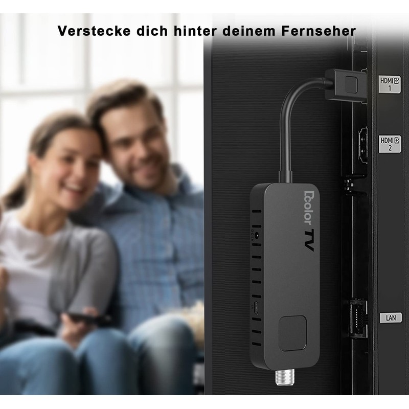 - đăDVB-S/S2 HDMI TV-Stick, AnschlieĂen und spielenăEingebaute HDMI-Kabel von Satelliten-receiver, um sich hinter dem Fernsehen zu verstecken, Es hat das Astra-Hotbird-Signal vorinstalliert, Erhalten Sie alle DVB-S/S2-KanĂ€le mit HD-Fernsehsendungen sogar auf dem Camping. Stecken Sie einfach direkt an das Fernsehen und einfach zu installieren.