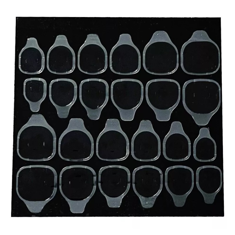 2. Busca el tamaño de tu uña según corresponda en los pegamentos, trata que abarque lo más posible tu uña, pero que no sobre pase, ya que de lo contrario se verá el pegamento