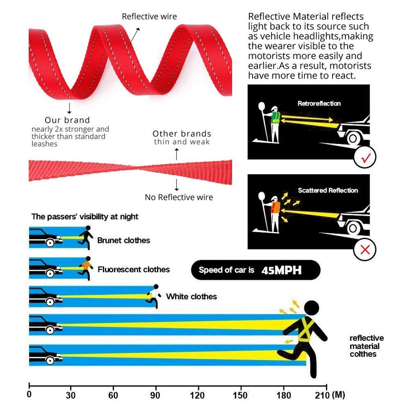 - 🐶 【HIGHLY REFLECTIVE FOR SAFETY】Reflective stitching adds high visibility at night and early morning,this stitching is very visible to carheadlights and helps keep you visible when crossing in crosswalks or walking along a street. dog leash with handle keeps you and your dog both safe during night walks.