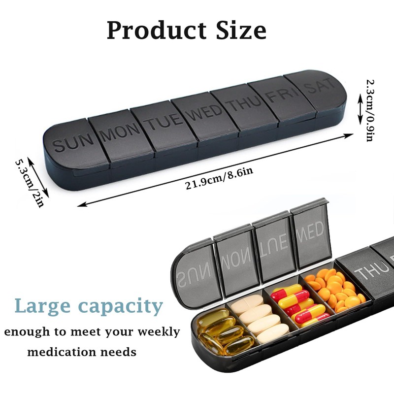 - 【Easy to Carry Daily Tablet Dispenser】 Our medication box is available in a 7-day pill pot with spacious portions in size. Simply organize it from Monday to Sunday once and have a better track of your medication for an entire week. No need to remember the daily dose. Store all your medicine once and enjoy complete peace of mind