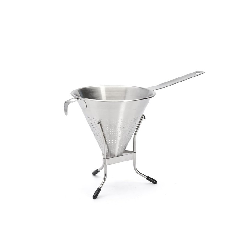 - There is a hook opposite the handle to fit the conical strainer inside a pan