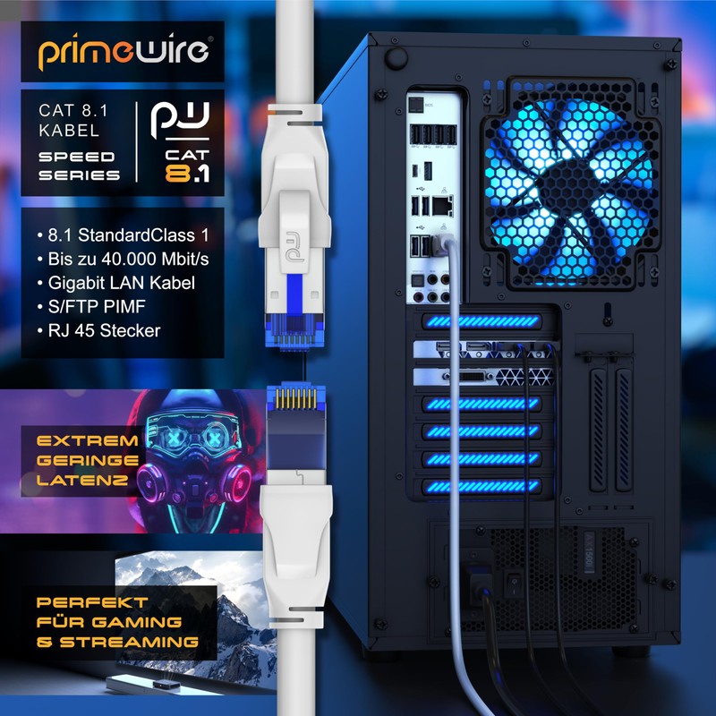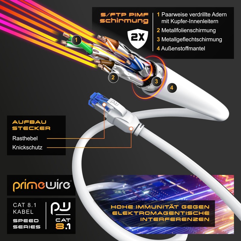 - If you want to benefit from a really high transfer speed: the Primewire CAT 8.1 network cable (8.1 standard, Class 1) allows an impressive speed of up to 40 Gbps. Ideal for 10 / 100 / 1000 / 10000 / 25000 / 40000 MBit Ethernet networks | 304037