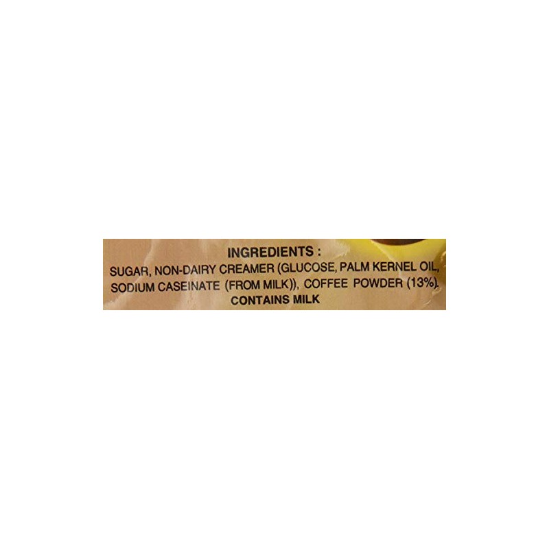 - Ingredients: Sugar, Non-Dairy Creamer (Glucose, Palm Kernel Oil, Sodium Caseinate (From Milk)), Coffee Powder (13 percent ). Contains Milk