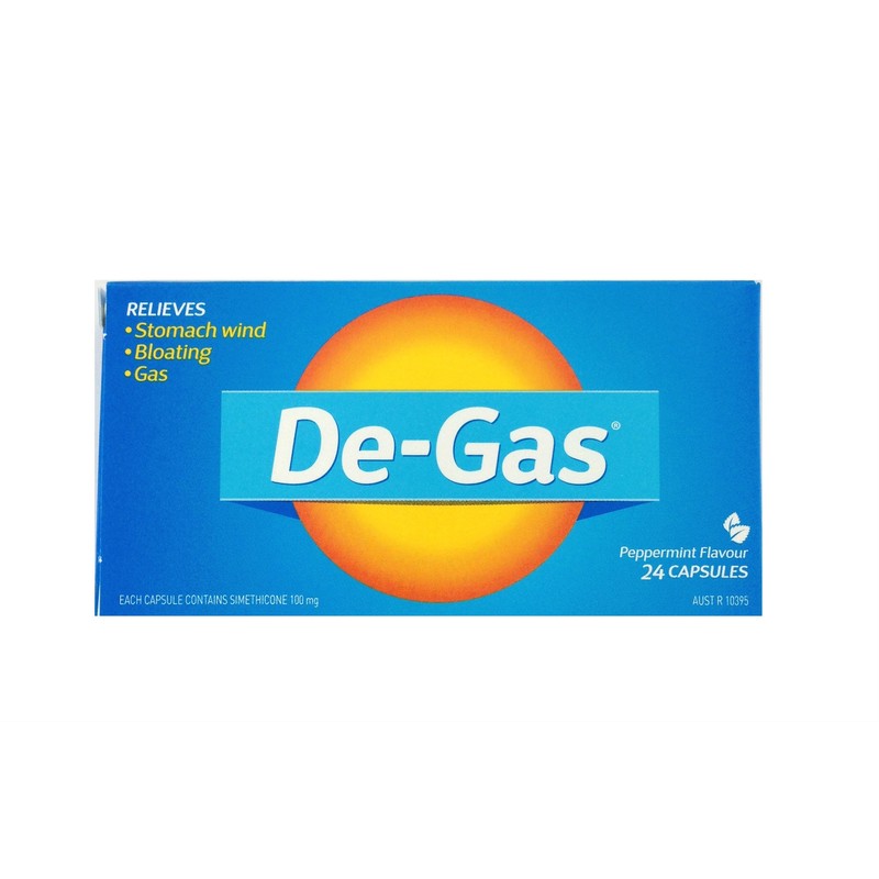 De-Gas is a peppermint-flavoured capsule for the relief of stomach wind discomfort caused by the build up of natural gas in the body.