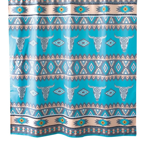 - UNIQUE STYLE: Embrace the rustic vibes of the country with this southwestern geometric tribal style cow bull longhorn skull themed decorative shower curtain. This stylish curtain tooled bull skulls and many southwestern geometric tribal style shapes in colors of sky blue, black, orange, beige, brown, and white. These bright boho tones make this shower curtain fit with any western, southwestern, farmhouse, country, rustic, or tribal themed bathroom décor. It is sure to be a hit with any outdoor or western themed enthusiasts.
