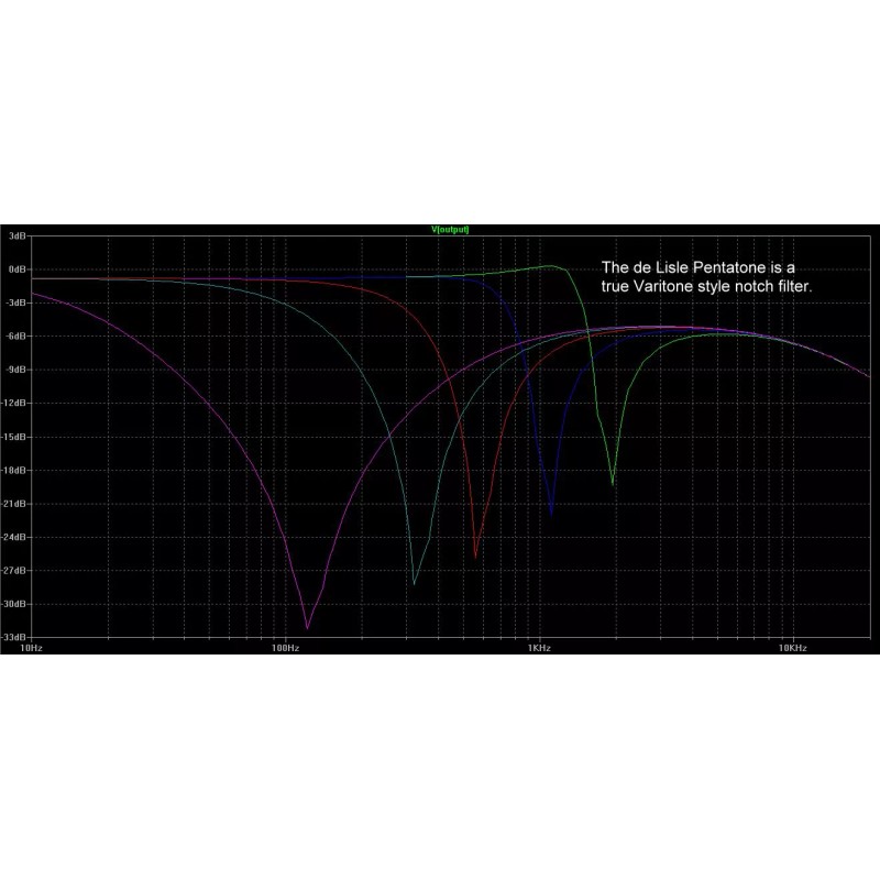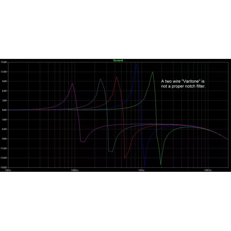 This is the same passive tone control that we use in our guitars. It's similar to the Gibson Varitone switch in function. We use a quality 6-position switch that features five frequency settings in addition to bypass. Our design is vintage correct and a true notch filter. A "two wire" Varitone is not a proper notch filter. See the picture above for the frequency response. The Pentatone switch comes pre-assembled and ready to install--just connect the input and signal and ground output wires. Auction includes chicken-head knob, our 6 position black dial plate and the switch.