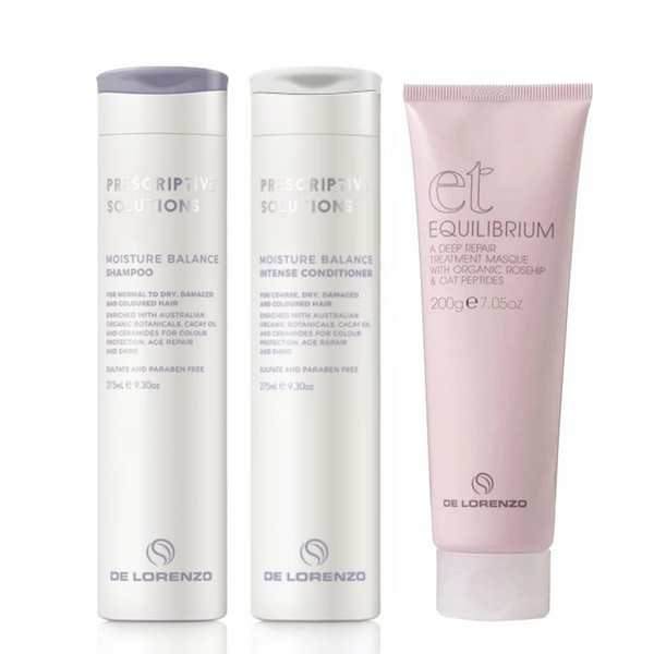 The De Lorenzo Prescriptive Solutions Moisture Balance Intense Trio Bundle is the ultimate hair care solution for achieving hydrated and healthy hair. This bundle is designed to provide intense moisture and nourishment to dry and damaged hair, using natural ingredients and advanced formulations. The Moisture Balance Shampoo gently cleanses while maintaining the hair's natural moisture balance. The Moisture Balance Intense Conditioner deeply conditions and detangles, leaving hair soft and manageable. The Essential Treatments Equilibrium Masque offers a luxurious treatment that restores and revitalizes, ensuring your hair looks and feels its best. What is included in De Lorenzo Prescriptive Solutions Moisture Balance Intense Trio Bundle? • Moisture Balance Shampoo 275ml • Moisture Balance Intense Conditioner 275ml • Essential Treatments Equilibrium Masque 200g What are the features and benefits of De Lorenzo Prescriptive Solutions Moisture Balance Intense Trio Bundle? Moisture Balance Shampoo: This shampoo is formulated to gently cleanse the hair while preserving its natural moisture. It is enriched with natural ingredients that help to hydrate and protect the hair, making it ideal for daily use. Moisture Balance Intense Conditioner: This conditioner provides deep conditioning and detangling benefits, leaving hair soft, smooth, and manageable. It is designed to enhance the hair's natural shine and improve its overall health. Essential Treatments Equilibrium Masque: This intensive treatment masque is perfect for restoring and revitalizing dry, damaged hair. It delivers a powerful dose of moisture and nutrients, helping to repair and strengthen the hair from within. Who is De Lorenzo Prescriptive Solutions Moisture Balance Intense Trio Bundle for? This product is for anyone looking to restore moisture and vitality to dry, damaged hair.