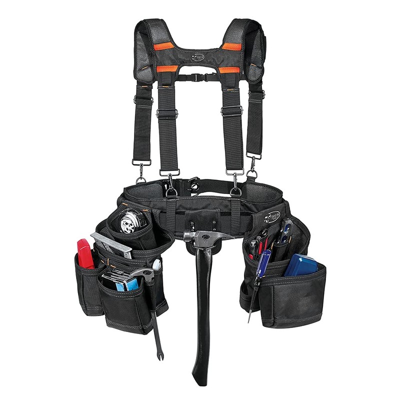 - 17 inside pockets and 7 outside pockets with a drill holder, steel-loop hammer holder, tape-measure holder and more