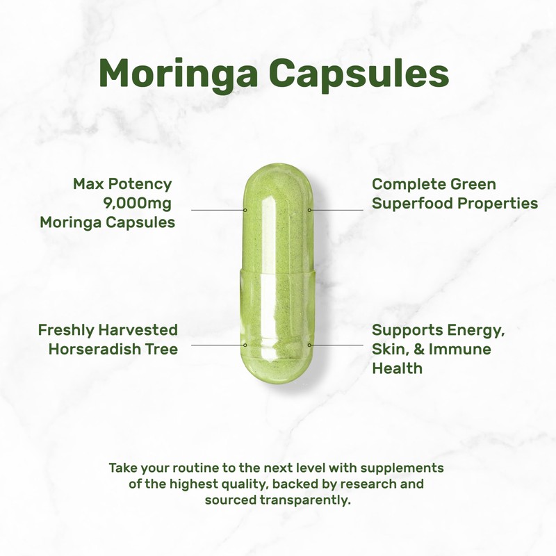 - Special Features C Max potency Moringa Oleifera capsules, 9,000mg herbal equivalent per serving as horseradish tree, a complete green superfood packed with antioxidants, fiber, vitamins, and minerals.