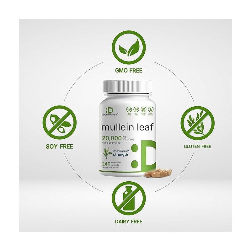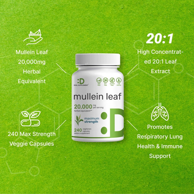 - Special Features C 240 veggie capsules that contain pure Mullein Leaf powder, offering a powerful 20,000mg herbal equivalent. Each serving includes a 20:1 max strength leaf extract.