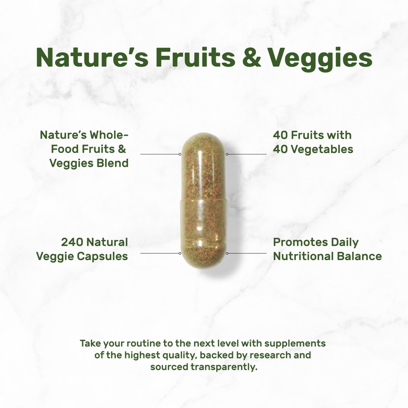 - Special Features C Nature's Fruits & Veggies whole food supplement. 240 veggie capsules packed with 80 fresh superfoods. Retains natural vitamins, minerals, phytonutrients, and antioxidants.