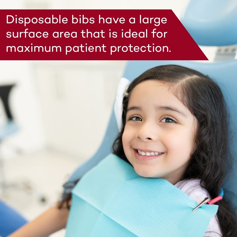 - Disposable Dental Bibs: Dealmed’s White Dental Bibs (Case of 500) are composed of high-quality material that is soft and absorbent. They are designed to combine client comfort with superior performance. Enough quantity for daily use and large enough to provide maximum protection and coverage. Once done using the bibs, simply dispose and make cleaning quick and easy.