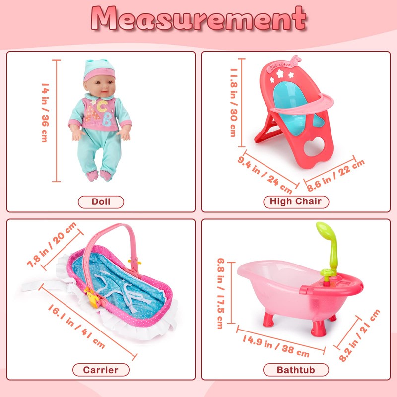 deAO Baby Doll Set 14" Baby Doll Playset,25 PCS Baby Doll Accessories with High Chair, Bath, Crib, Feeding Accessories, Realistic Pretend Play Baby Dolls for 3+ Year Old Girls, Gift for Christmas