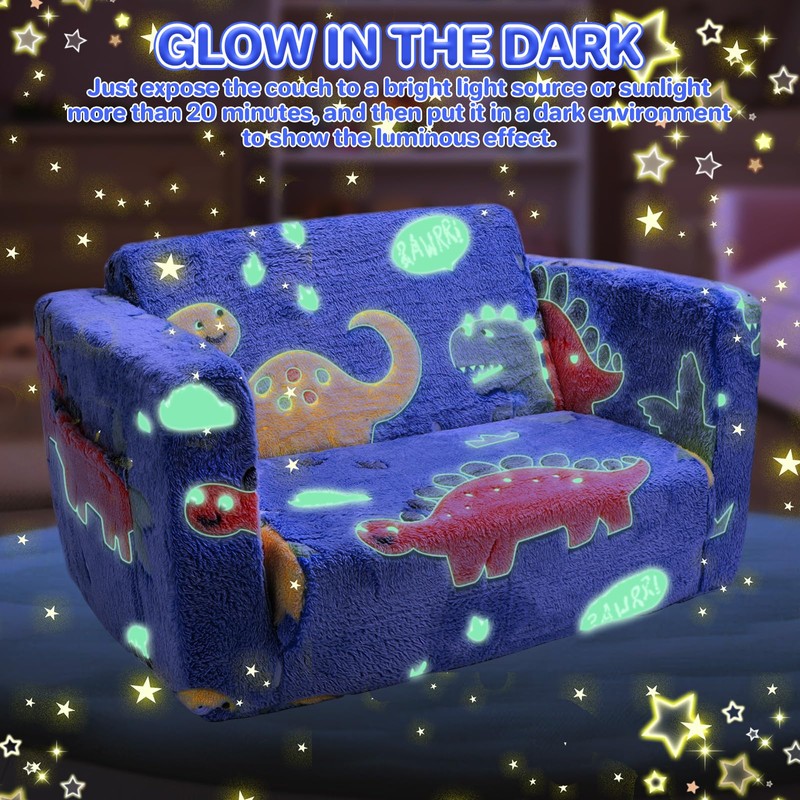 - Glow-in-the-Dark Kids Sofa: Our toddler couch features special luminous dinosaur patterns that glow softly after exposure to light. Simply expose the couch under sunlight or room light for 20+ minutes to enjoy the enchanting nighttime glow.