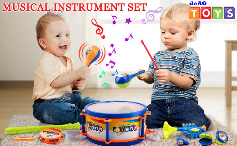 deAO Musical Instrument Toys, Children's Drum Set With Trumpet Flute Harmonica Children's Beginner Music Percussion Set Puzzle Instruments Toys Gifts