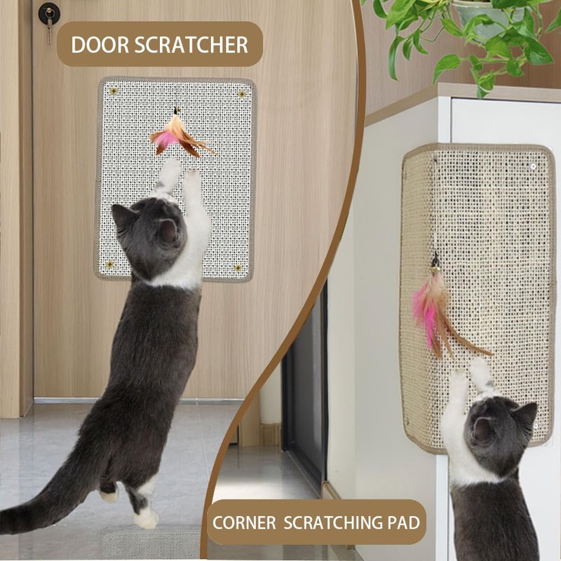 - TWO INSTALLATION METHODS: This cat scratch pad comes with 4 damage - free adhesive pads. There's no need for drilling. It's suitable for smooth surfaces like wood and tiles, adhering firmly and leaving no marks when removed. Besides Four 6mm expansion bolts are provided, which are adaptable to walls and corners