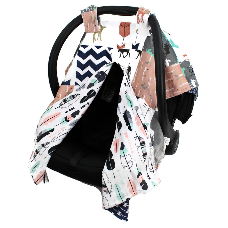 Dear Baby Gear Deluxe Reversible Car Seat Canopy, Custom Minky Print, Woodland Deer Quilt Feathers Pink Mint