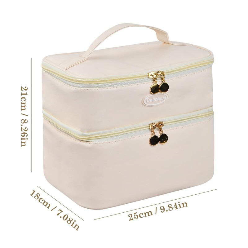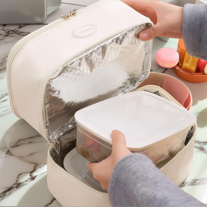 DEARBAG Lunch Bags with Handle for Women, Reusable Leakproof Lunch Box Tote Bag, Portable Insulated Cool Bags, Packed Thermal Cooler Bag for Work, School, Picnic and Travel (Beige) (Double-Layer)