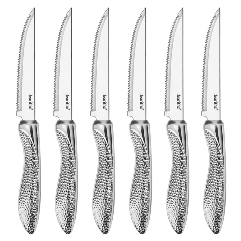 dearithe Steak Knives Set of 6, Stainless Steel Serrated Sharp Blade Steak Knife Set, Hammered Pattern Handle,4.5 In,For Kitchen Restaurant Tableware, Dishwasher Safe