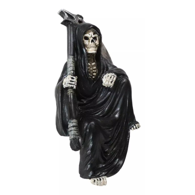 • Death on the Shelf is the perfect term for this macabre sculpture. A mean grinning grim reaper sits on the ledge with his scythe on his shoulder. Sitting loosely with his left leg up, the reaper has all the time in the world to harvest any deserving soul. Sticks to an edge surface with double sided tape.