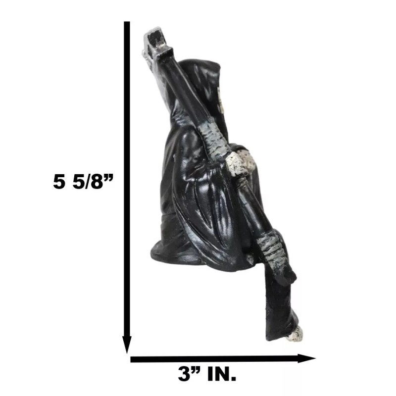 • Death on the Shelf is the perfect term for this macabre sculpture. A mean grinning grim reaper sits on the ledge with his scythe on his shoulder. Sitting loosely with his left leg up, the reaper has all the time in the world to harvest any deserving soul. Sticks to an edge surface with double sided tape.