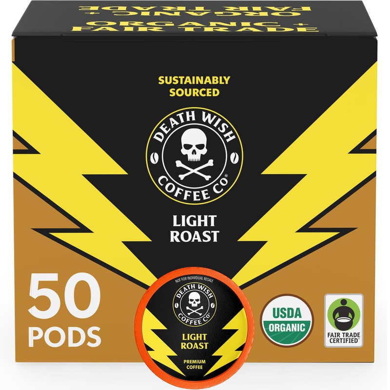 Death Wish Coffee, Organic and Fair Trade, Light Roast Coffee Pods (50 Count)