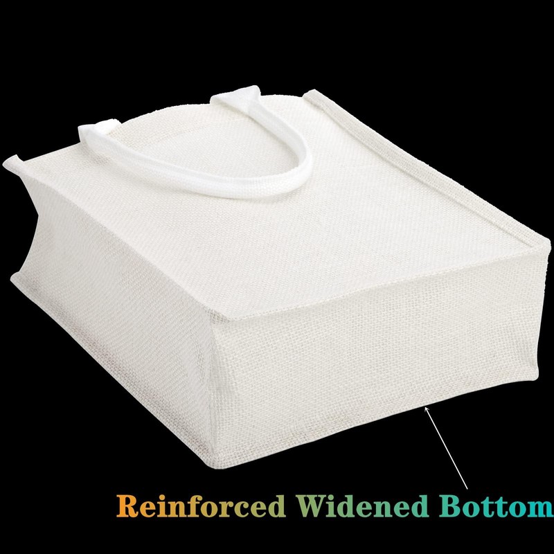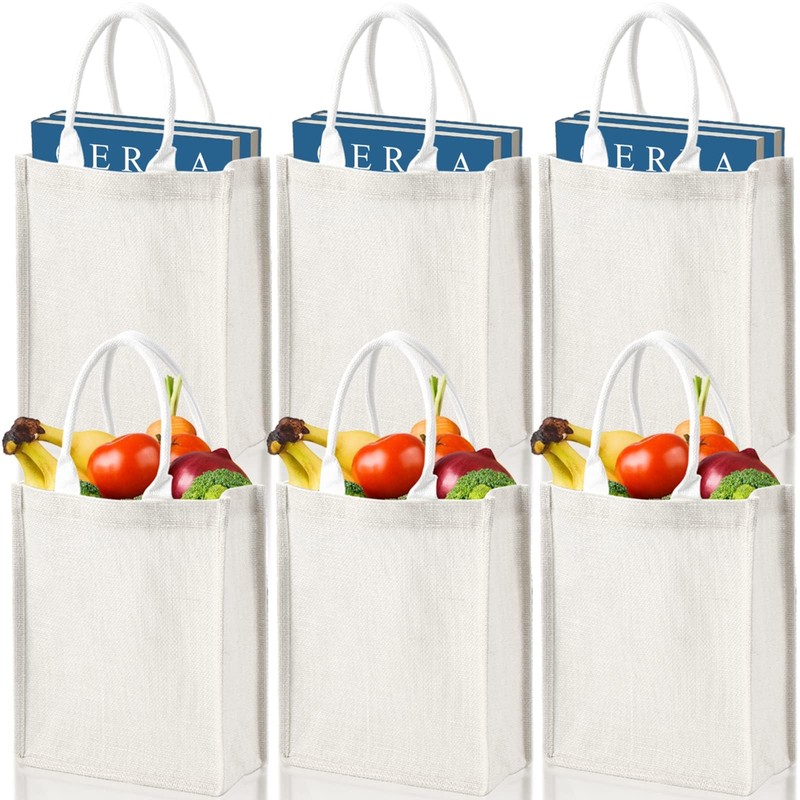 DEAYOU 6 Pack Jute Tote Bag with Handle, Jute Beach Tote Laminated Interior, Reusable Lined Grocery Shopping Bag for Bridesmaid, DIY, Wedding,9.8''x11.8''x3.9'', White