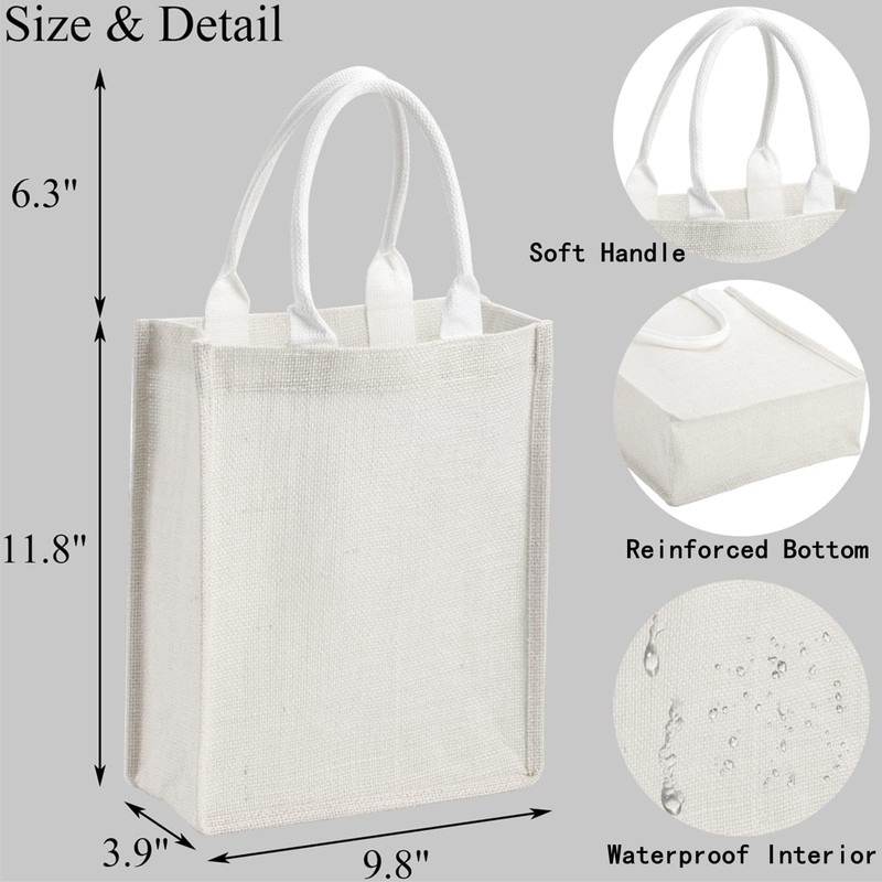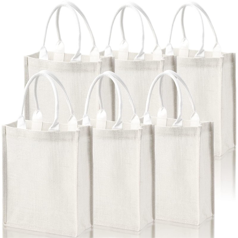 - Package includes 6 packs of burlap jute tote bags. Each white jute gift favors tote measures approx. 9.8'' L x 11.8'' H x 3.9'' W, handle is approx. 6.3" high. Sufficient quantity to meet your diverse using and replacing needs. Suitable size to store books, drinks, snacks, makeups, fruits and veggies, ideal for everyday life