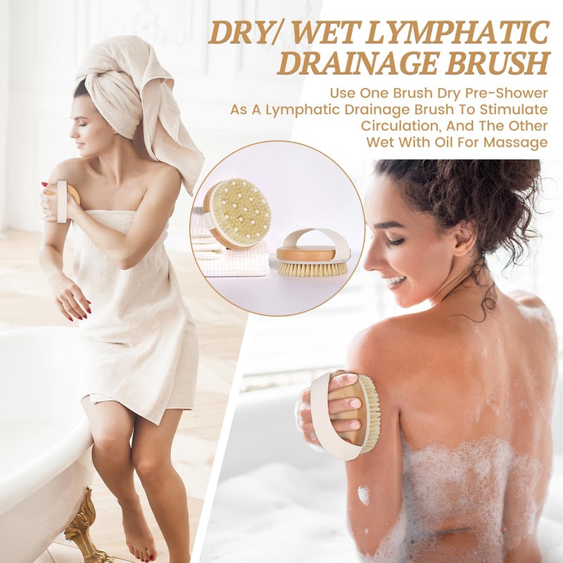 - ✅【Dry/Wet Lymphatic Drainage Brush】 Use one brush dry pre-shower as a lymphatic drainage brush to stimulate circulation, and the other wet with oil for massage. The 2-pack set offers hygiene replace and full-body coverage.