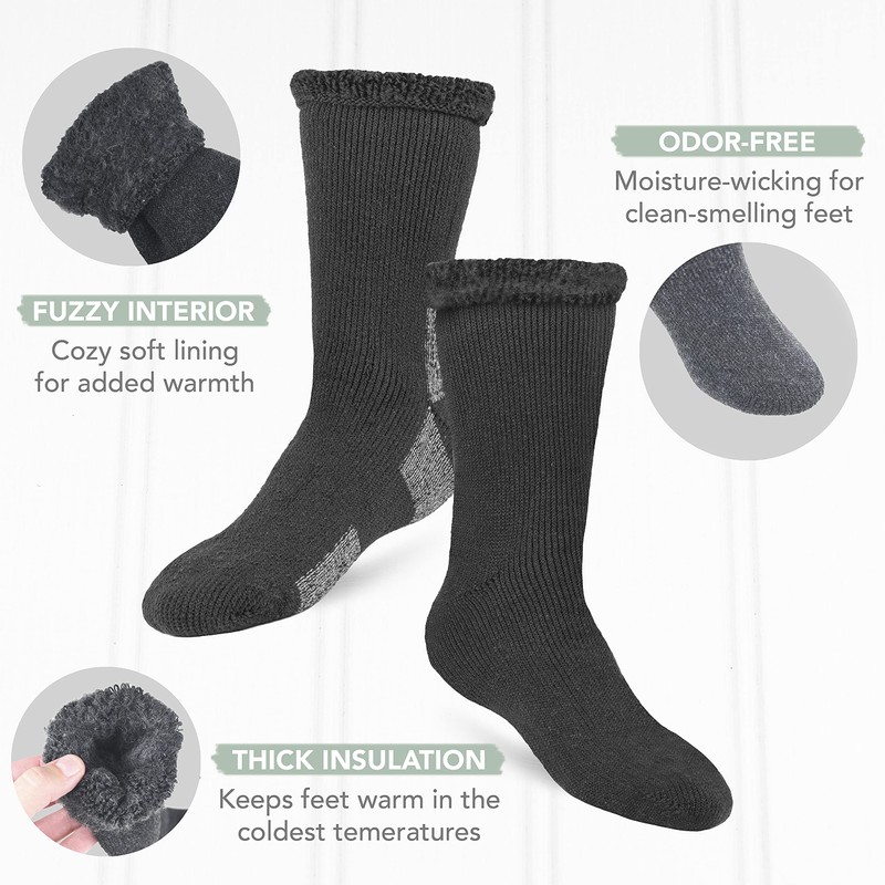 - MOSITURE-WICKING TECHNOLOGY-These insulated socks are innovatively designed with moisture-wicking fibers that will keep your feet snuggly dry and delightfully odor-free despite the thick construction and intense warmth.